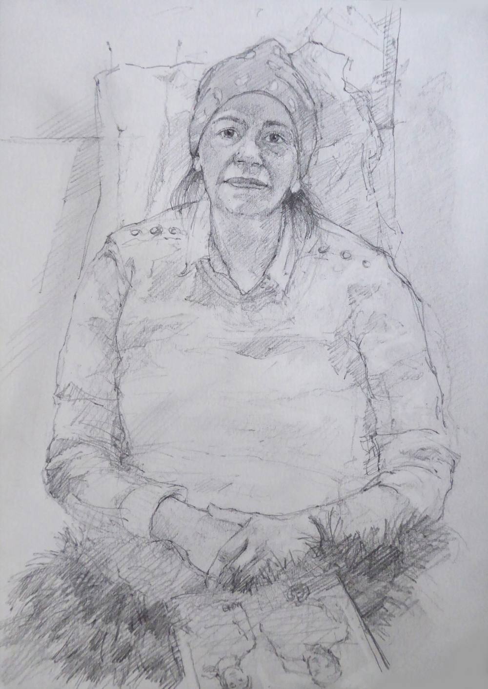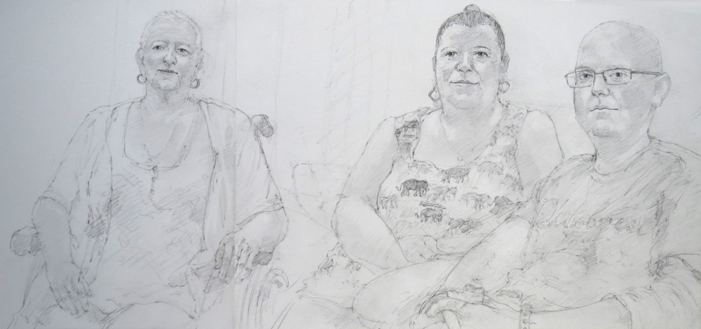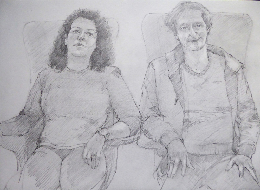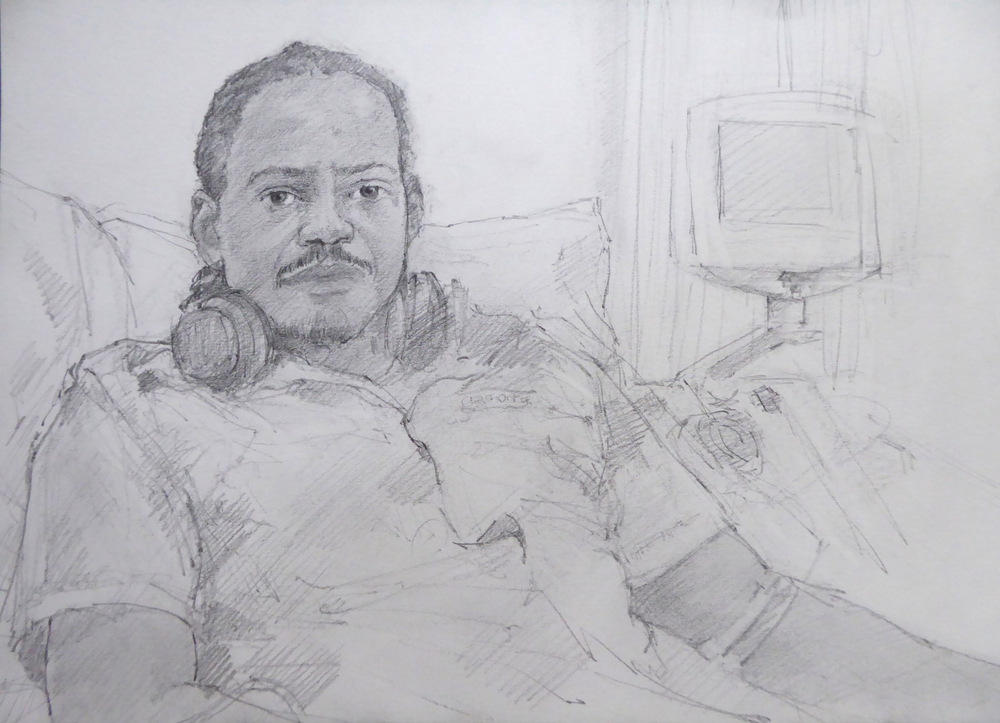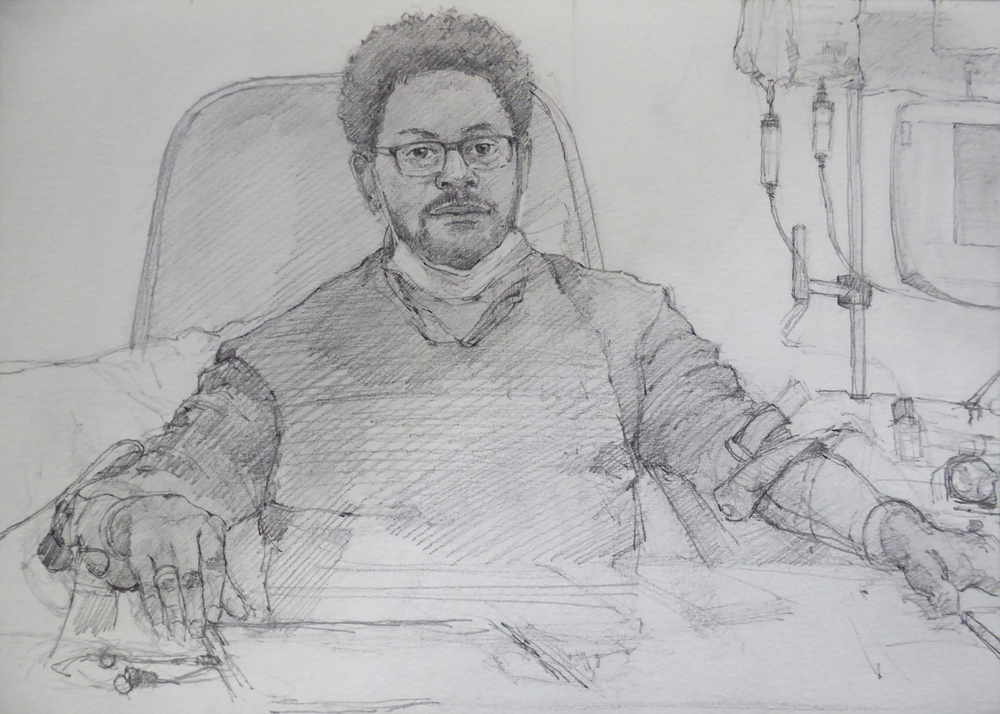 Artist Simon Tolhurst is pleased to announce an exhibition of drawings made during a residency for Haematology Cancer Care, UCLH Charity, from 2013-2023. Exhibited artworks are portraits of patients undergoing treatment for cancer or haematological conditions at University College London Hospitals NHS Foundation Trust. Portraits were created during chemotherapy or other treatments and often include the patient’s loved ones in double or group portraits. The Portrait Project has been featured in national and local press, BBC and ITV online news. The BBC have made two short films about the project, the first in 2017 titled ‘The Artist Who Draws Cancer Patients’, and in 2023 for BBC ‘The One Show’, a film with Victoria Derbyshire, by Topical Productions.