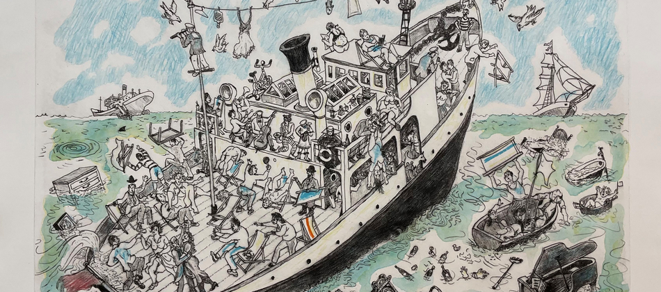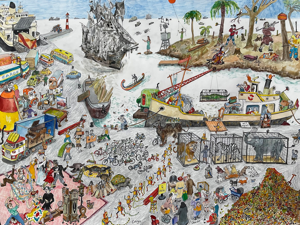 My new painting, ‘Cargo’, a successor to the earlier ‘Ship’ painting, deals with the many sided idea of what we carry and send around the world. On the quayside cages of wild animals, mountains of fruit, dancing couples, a collection of cricket bats, bicycles, grandfather clocks and robots prepare to be shipped. Entering the harbour is the ‘Black Freighter’ a ghost ship. De-forestation is going on in the top right side of the painting. This is about the consequences of exploitation.