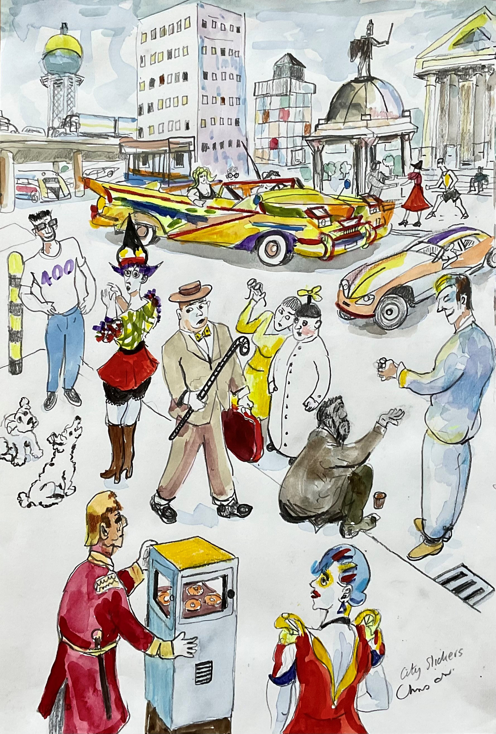 In my series ‘Burns and McGonagall’ I create an unlikely duo - my Two Musketeers who get into all sorts of scrapes. They are loosely based on Robert Burns, the Scottish National Poet and William Topaz McGonagall reckoned to be one of the world’s worst poets. Living in different times they never could have met, let alone become chums. McGonagall unfailingly puts his foot in it. Burns is the serious one, although even he has his fling. Each painting is an independent work but the whole series is a kind of visual French Farce exploring ideas from Babysitting to working for Scrooge.