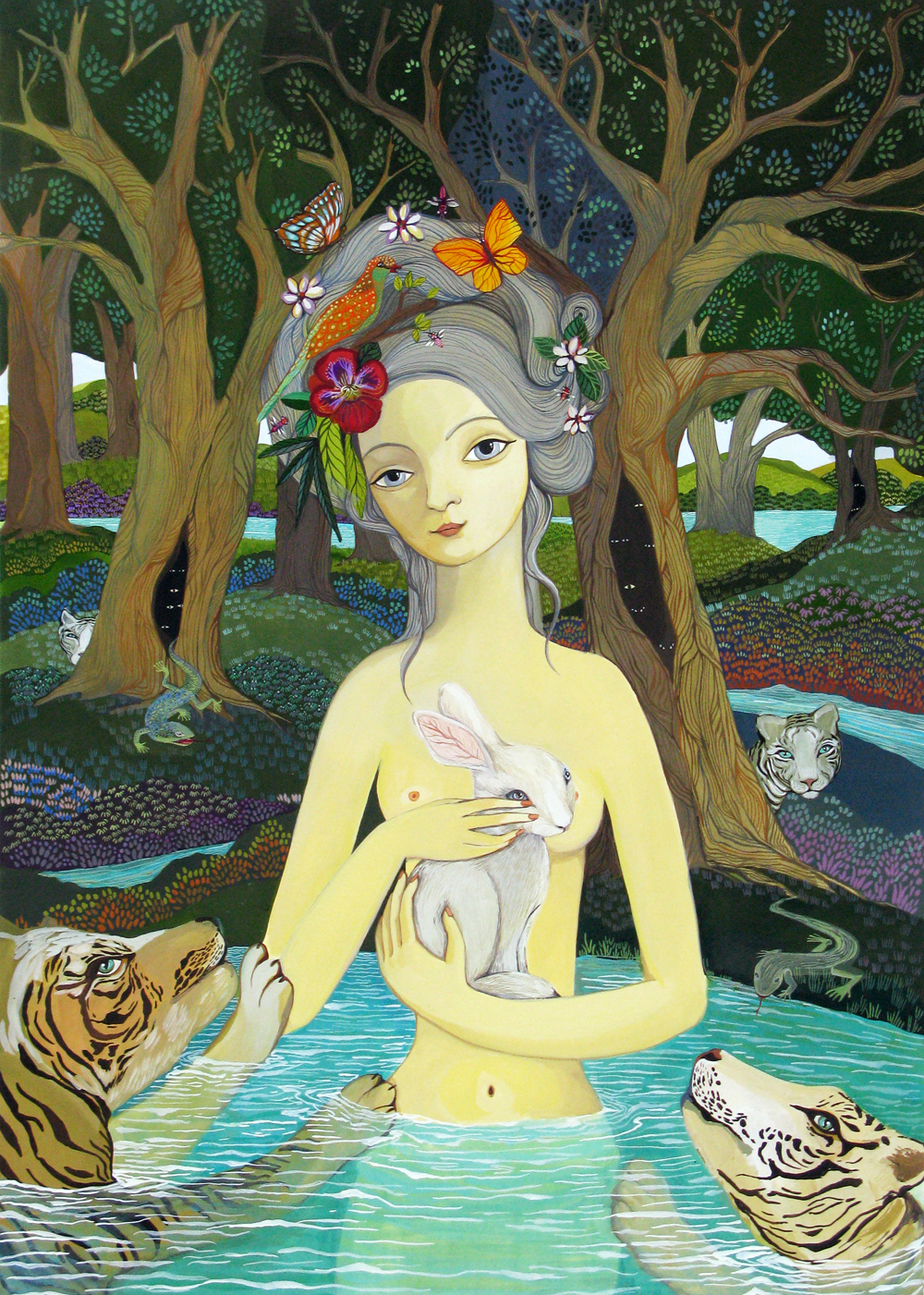 Melissa Launay’s first solo exhibition at The Coningsby Gallery captures her at a point which not only defines her love of myth, nature and fantasy, but also refers to Oriental miniature painting and the warm, vibrant hues of the Arab World. She cites artistic sources ranging from Sandro Botticelli, Gustav Klimt, Henri Rousseau, Frieda Khalo and the German illustrator, Olaf Hajek, all of which inform her work.