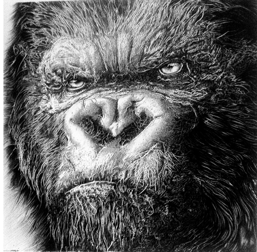 The show features 13 or 15 large size black ink portraits - including large representations of animals such as elephants and gorillas - from different cultures, created over a period of 6 years, between 2010 and 2016.