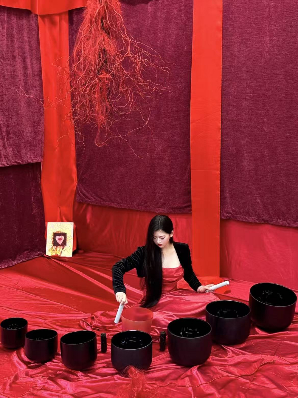 Medium: Performance installation Theme: Red silk, branches, Tibetan singing bowls, sound, body, meditation Duration: 3 hours Premiere: 2025, London