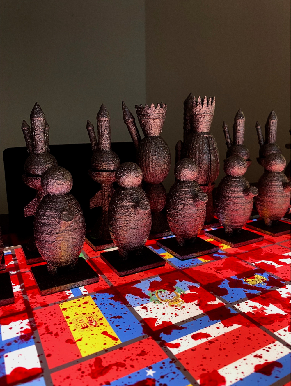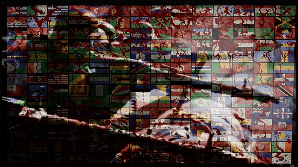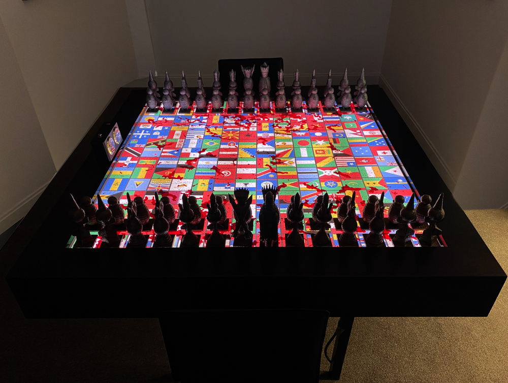 This series of work titled UNITY, conveys a message of putting a stop to unnecessary wars at the expense of innocent human civilians, who are like pawns on a chess board. Cahn has created two installations of light boxes; one being a large chessboard with 196 flags, representing the 196 countries of the world. The chess board comprises of 196 squares and is on a grid of 14 x 14 with 28 pieces, instead of the standard chess board that comprises of 64 squares of 8 x 8 grid and 16 pieces. As chess is a very strategic game with two opposing players, the arrangement of the 196 flags were also strategically positioned on the board.