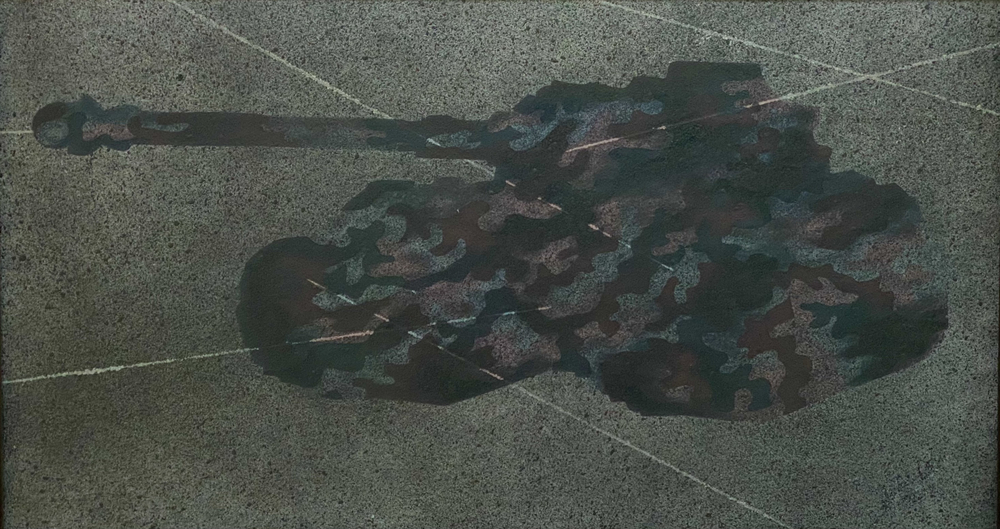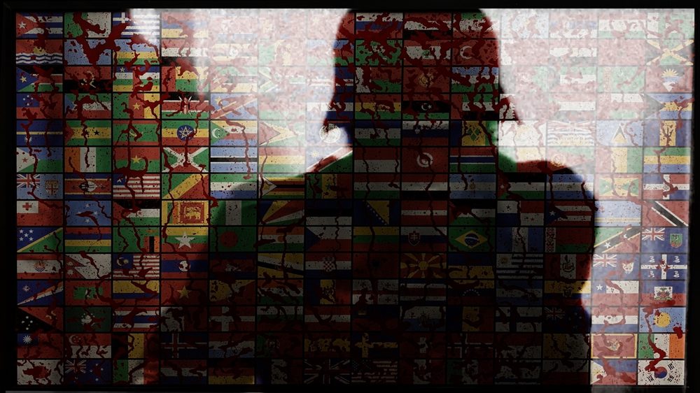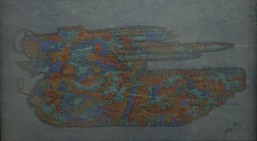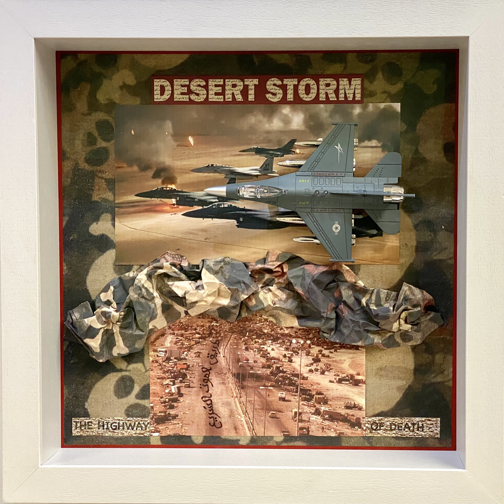 The other light box has a black and white film projected over the 196 saturated coloured flags. The film is a compilation of war footage, dating back to WWI and features a soundscape blending together the sounds of warfare. The senses are enlivened through sound and space to immerse the viewer in the obscure vision of warfare. In addition, Cahn has created some paintings representing silhouettes of tanks, fighter planes and AK 47s. She has also created some assemblages, whereby three dimensional collages are created with found objects to a two dimensional surface.