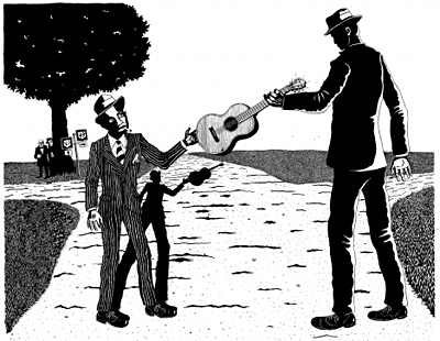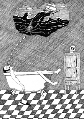 A heavily pregnant woman enters a lift, a man swims into the ocean in the middle of the night, another man wakes up on the pavement in Soho Square and a little girl decides to enter a dark forest on her own. This is how four of the twelve short stories contained in the book ‘Welcome to the Real World’ begin. They come from the mind of Dominik Klimowski where they sit together with memories of his own childhood, gothic fairytales, and ideas and recollections that have crept up on him ‘in the middle of the night when I’m not asleep, or awake.’ Each of the twelve stories is illustrated by a different artist, whose work both suits the workings of Dominik’s mind and in turn inspires them. In this sense it is a collaborative piece of work. ‘The idea is not to have a book with simple illustrations acting as a visual guide to what you are reading. It should be seen as more of a whole, as one long dream interrupted by moments of waking.’ Whether the stories are the dreams, or the moments of waking, we can never be sure, but when coming to the end of the book one has an unnerving feeling that all the stories are inexplicably connected, despite their very different protagonists, locations, and even their timelines. This is one reason for the choice of artists to provide the visuals for the book. For in most of the tales the locations are not revealed, yet some suggest Eastern Europe, the Middle East, and even the United States, while those stories that do specify a location are heavily rooted in London, specifically the artier, trendier areas. The title ‘Welcome to the Real World’ alludes to the fact that all the stories use as their main theme Dominik’s personal experiences, or those described to him by close friends. This can come as quite a surprise when you read them, but of course as we all know, the real life element can be stranger than the fiction. The characters that inhabit the tales, particularly the main protagonists are often ‘people who are either experiencing some kind of crisis, or imagining how their life would be if they followed a different road. Their habits and characteristics stem from insecurity and a general feeling of being lost and all alone. I’d like to categorically state that I’m not suffering from any crisis, but you sometimes you have to wonder when your work touches on the same themes more than once.’ Of course it can be argued that there are fewer lonely careers one can follow than that of an artist or a writer.