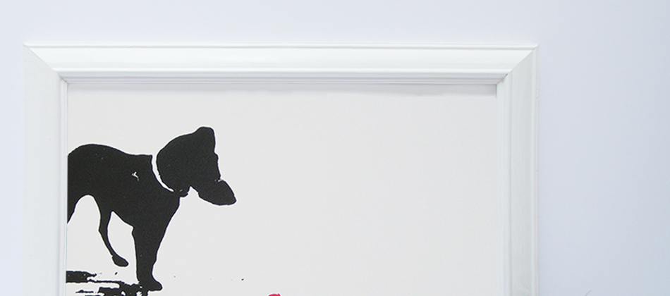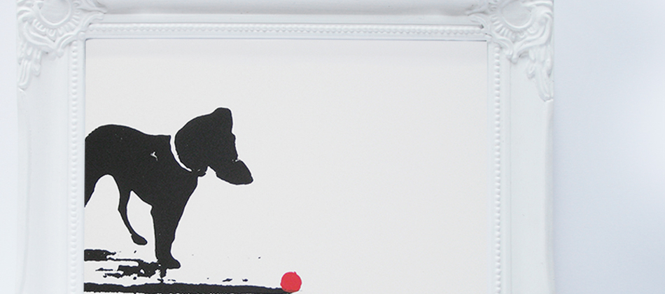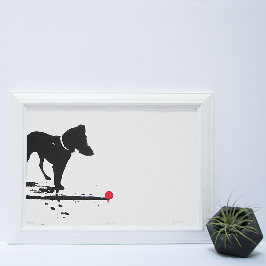 This piece explores the playful qualities of this dog on a beach wanting someone to throw its red ball. Limited print run of 100, 2 colour silk screen print on Fabriano Ruvidi 200gsm paper.